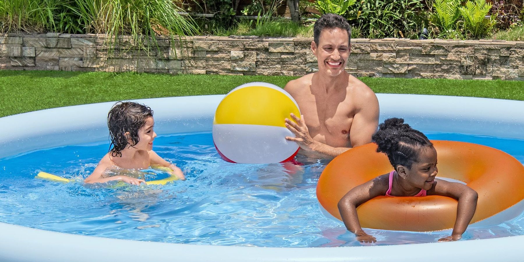 Unlike in‑ground swimming pools which require digging and considerable setup time, a Fast Set™ inflatable swimming pool can be quickly setup on any flat surface. Simply inflate the top ring and watch the pool rise as it is filled with water.