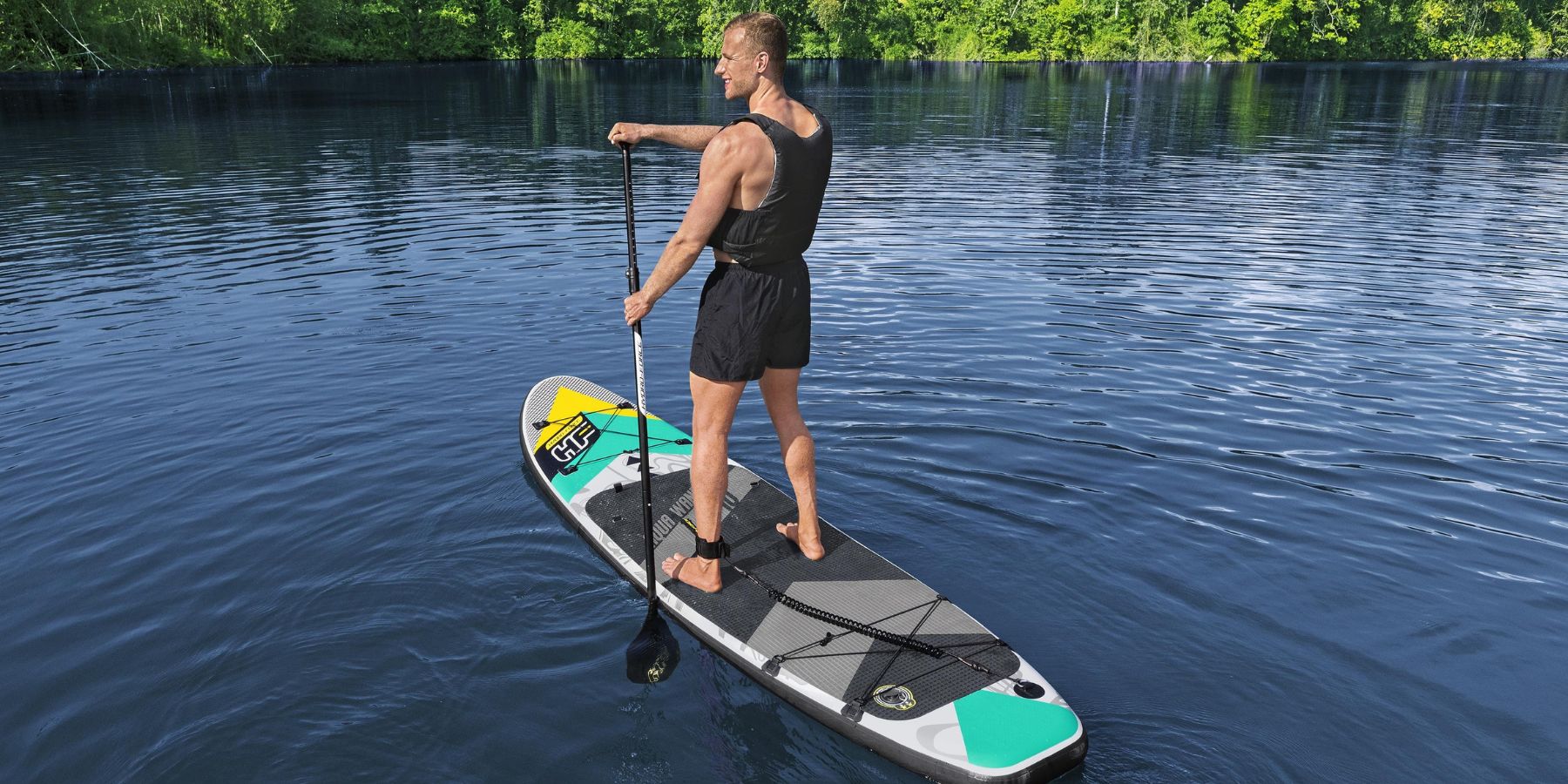 Perfect for those longer rides on the water, the HydroForce™ Aqua Wander™ TravelTech™ convertible inflatable stand-up paddle board set is a 2-in-1 all round SUP that can be easily converted into a sit-down paddleboard for extra comfort.