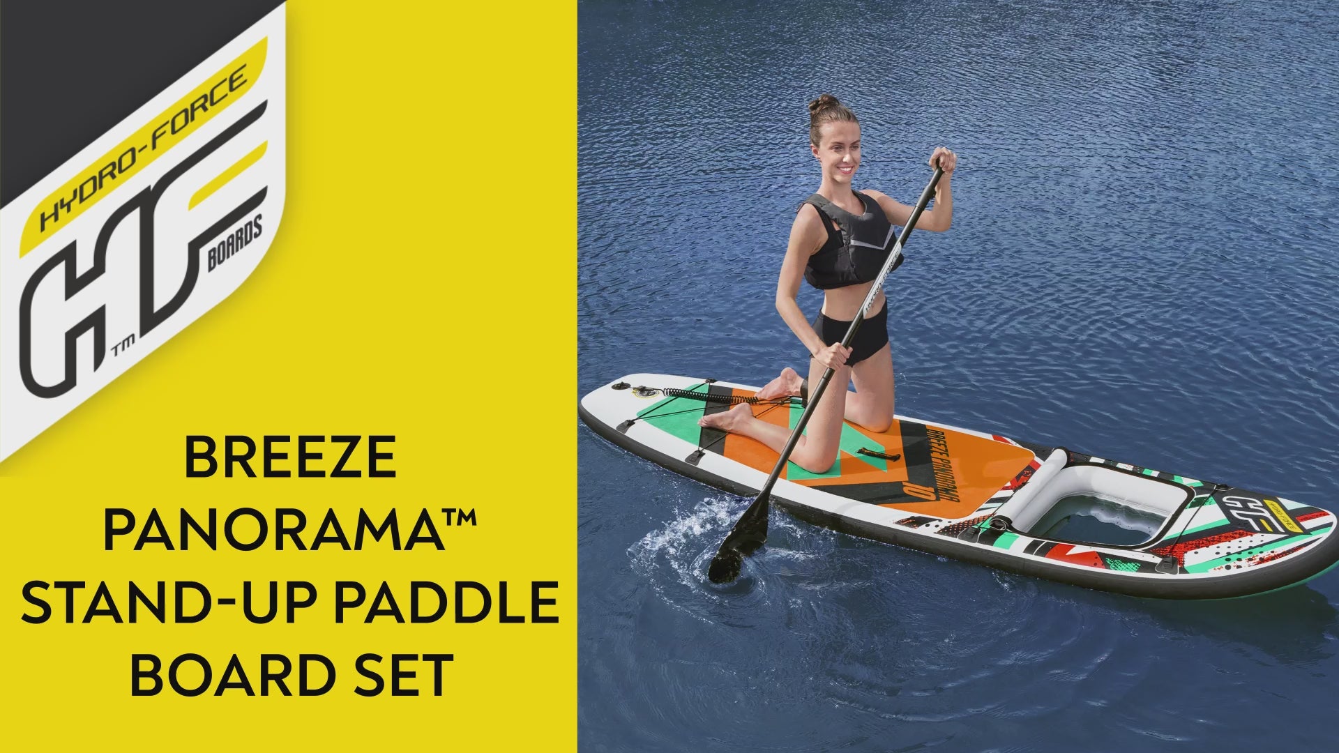 The Hydro‑Force™ Breeze Panorama™ inflatable stand‑up paddle board set is ready for water exploration. The all round paddle board has a built‑in window, with a retractable cover, that offers a unique experience on the water where can see through to the water below, and gaze at the fish and other aquatic animals as they swim by.