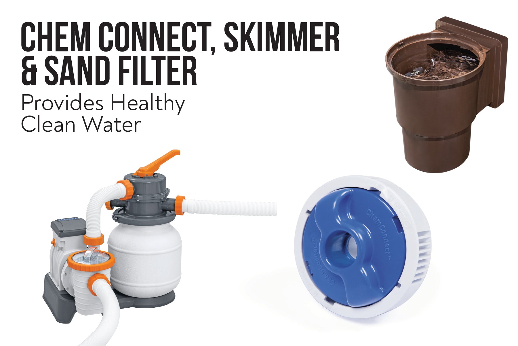 This pool set comes with a sand filter, a built‑in surface skimmer, a ladder, a ground cloth, a pool cover and a ChemConnect™ chemical dispenser. The sand filter is a good alternative to a traditional cartridge filter pump with a longer lifespan, and the surface skimmer attaches to the side of the pool to work with the filter to remove unwanted debris from the water.