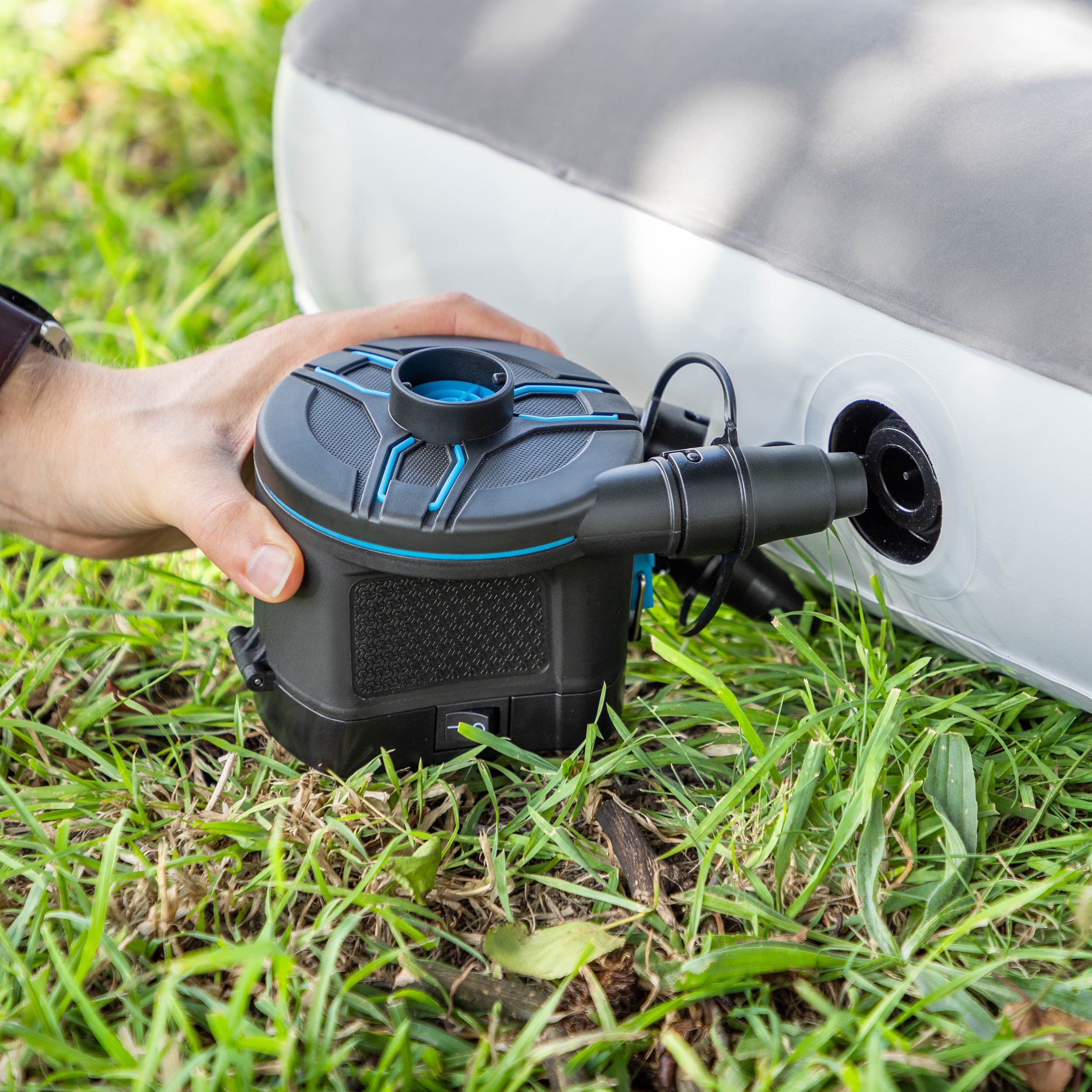 - Inflates in under 2 minutes using the included cordless battery handheld pump powered by 4x D Cell size batteries (not included). Perfect for using the airbed where there are no power sources