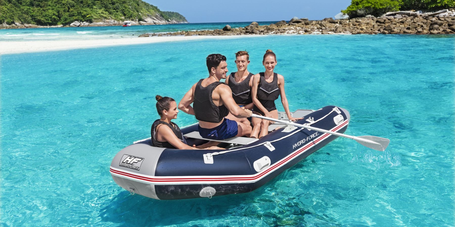 This RIB boat set includes a pair of two-piece 162cm (64in.) aluminium oars that can be positioned in the omni-directional oarlocks for efficient navigation. It also includes a quick-release drain valve, fixed buckle for oil box, 4 heavy-duty carry handles, an Air Hammer™ hand pump, 10m (33ft.) tow rope, carry bag and repair kit.