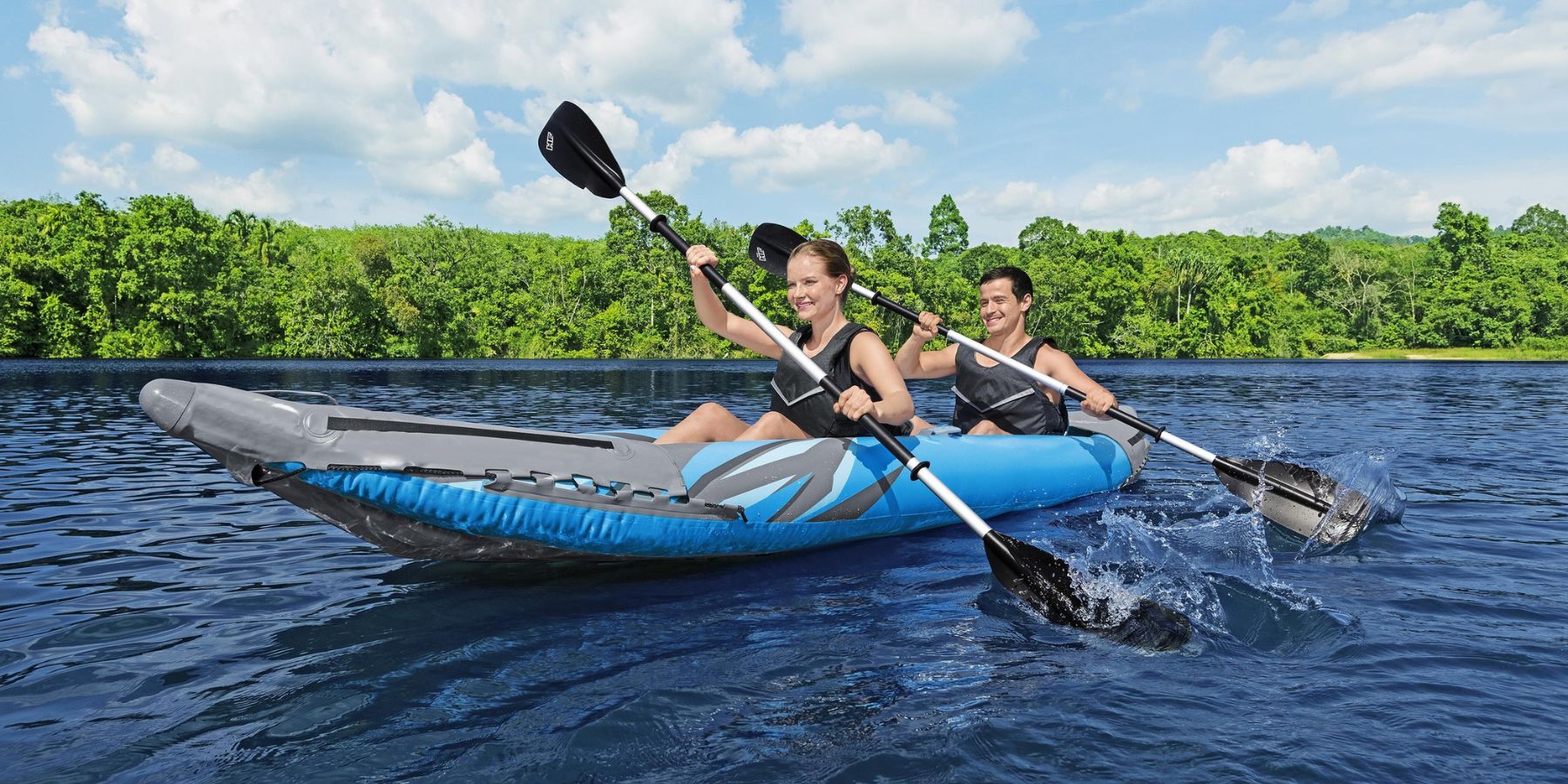Enjoy the ride even more thanks to the supportive backrests, raised seats and footrests. This kayak set includes 2 paddles, a pump, and 2 removable fins in different sizes for directional support in various water conditions, so you have everything you need for your next trip.