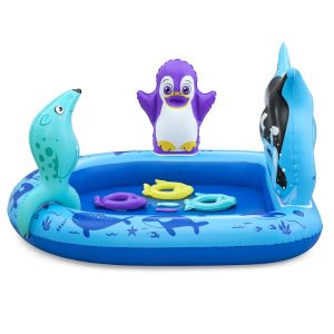 - Features an inflatable penguin with 2 foam fish toys for kids to splash with or feed into the penguins mouth! This paddling pool will let your kids imagination run wild and provide them with endless hours of fun!