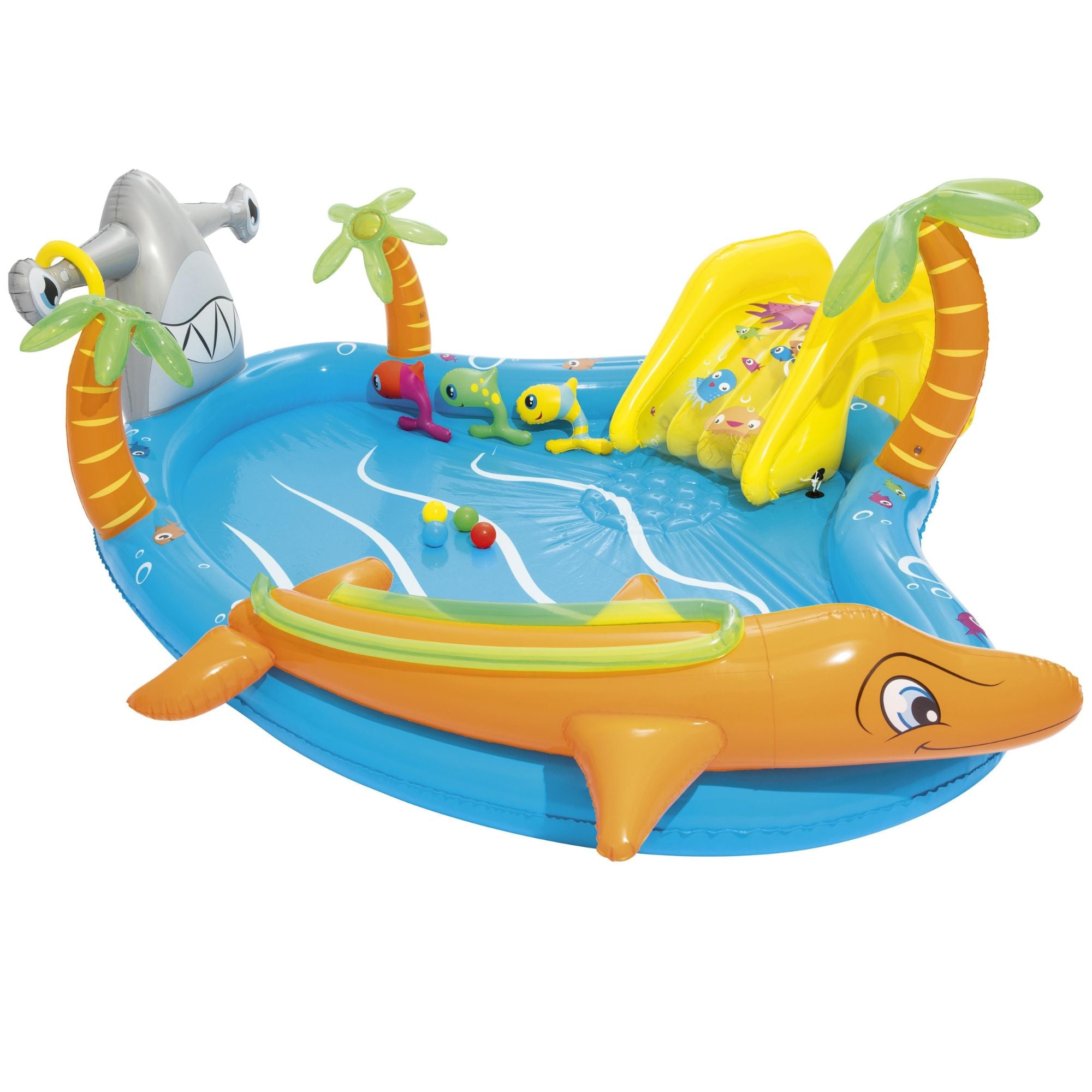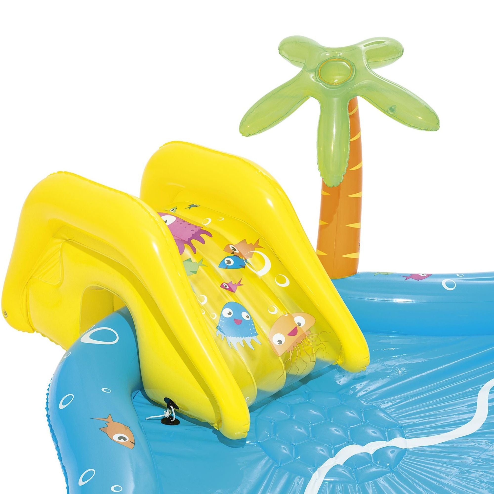 - The Bestway Sea Life paddling pool play centre comes as a complete set; featuring pool, slide, 3 inflatable fish, 1 ring toss, 4 play balls and a repair patch